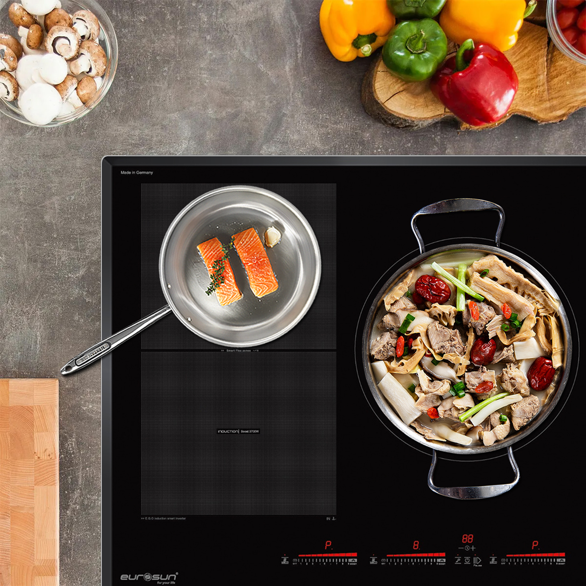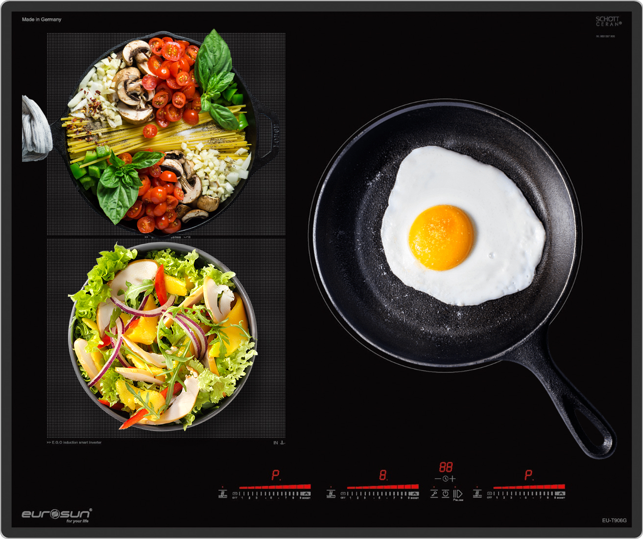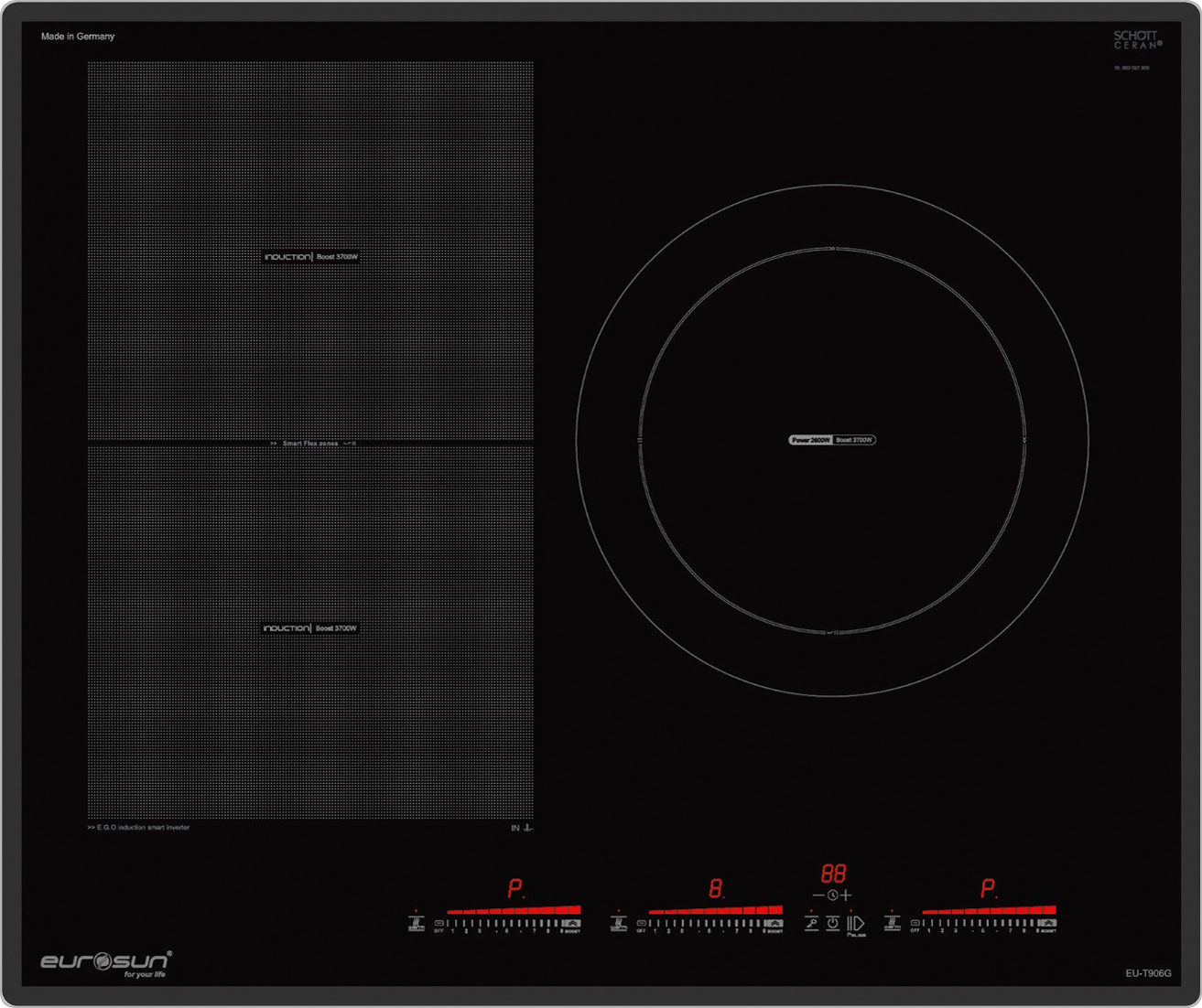 Bếp từ Eurosun EU-T906G với thiết kế sang trọng, tinh tế với các tính năng nổi trội, hứa hẹn sẽ là một người bạn đồng hành tin cậy cho các bữa ăn gia đình. Sản phẩm được nhập khẩu nguyên chiếc từ CHLB Đức. Bếp từ Eurosun EU-T906G là model sản phẩm phù hợp với những gia đình đông người – có nhu cầu nấu nướng thường xuyên. Với số lượng vùng nấu là 3 sẽ đáp ứng đầy đủ nhu cầu của gia đình bạn.