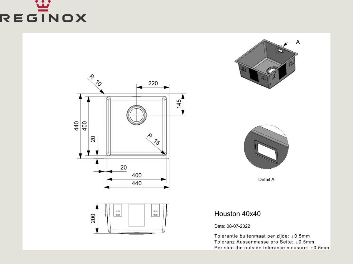 Chậu inox Reginox Houston 40 R32848 thiết kế chậu đơn với kích thước 440D x 440R mm. Trong đó, phần hố chậu có kích thước 400D x 400R. Độ sâu lòng chậu 200 mm đảm bảo dung tích sử dụng, hạn chế bắn nước ra ngoài trong quá trình rửa dọn. Độ dày thành chậu 0.9mm – là độ dày tiêu chuẩn trên các sản phẩm chậu rửa inox, đảm bảo tính thẩm mỹ cũng như độ bền chắc cho chậu.