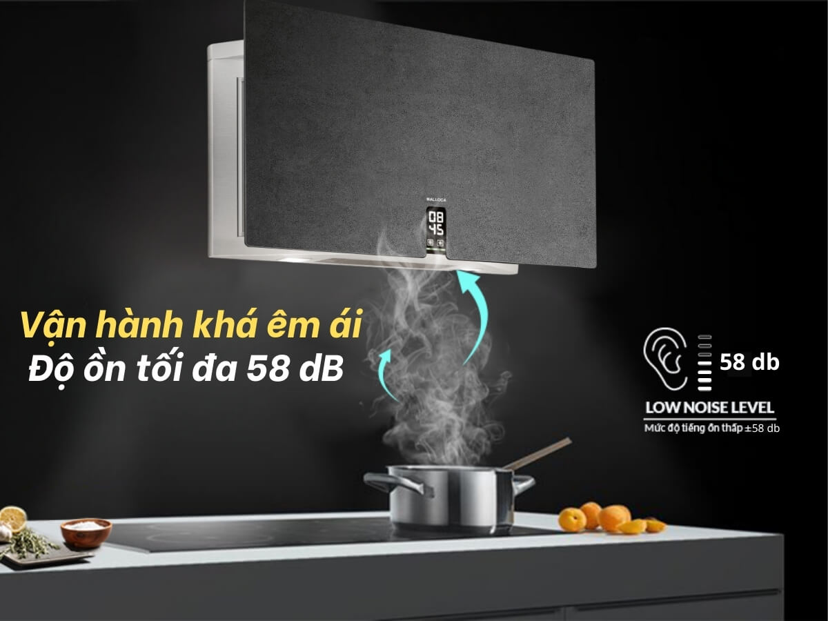 Với công suất hút lên đến 850m3/h đảm bảo không khí trong không gian bếp luôn sạch sẽ và thoáng mát. Điểm đặc biệt của máy là độ ồn khi hoạt động chỉ 58dB, giúp bạn yên tâm thực hiện công việc nấu nướng mà không bị ảnh hưởng bởi tiếng ồn.